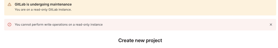 git clone and git pull. All write operations fail, both through the CLI and Web IDE with the error message: Git push is not allowed because this GitLab instance is currently in (read-only) maintenance mode.
