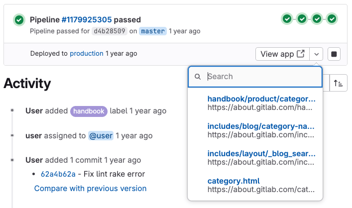 1. In the merge request widget, select View app. The dropdown list shows up to 5 mapped pages (with filtering if more are available).